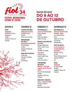 Paralelamente, o Programa de Sala deste #FIOT34 pisa forte esta fin de semana coa estrea en Galicia de Adolescencia infinita, de Pont Flotant (venres 10 de outubro, ás 21.00h, no Auditorio do Pazo da Cultura) e o descubrimento do mundo máxico de máscaras, actores e bonecos da Cía. Campi Qui Pugui, que nos achegará Matres o sábado 11 de outubro, a partir das 20.00 horas. A mesma velada do sábado 11, antes da representación de Matres, o Auditorio do Pazo da Cultura de Carballo acollerá a gala de entrega do premio Xograresa de Outono 2025 a Areta Bolado, da compañía A Panadaría.